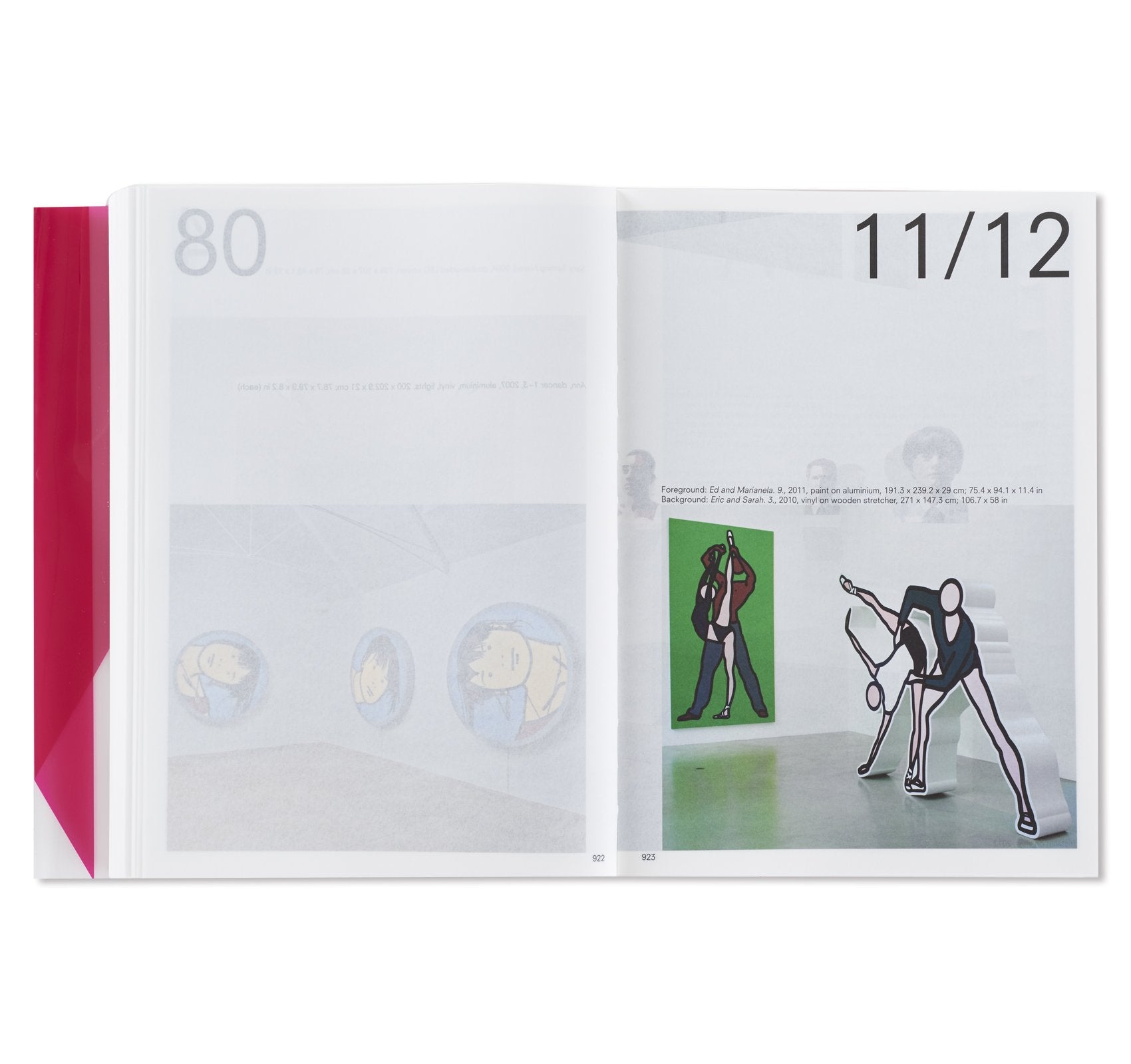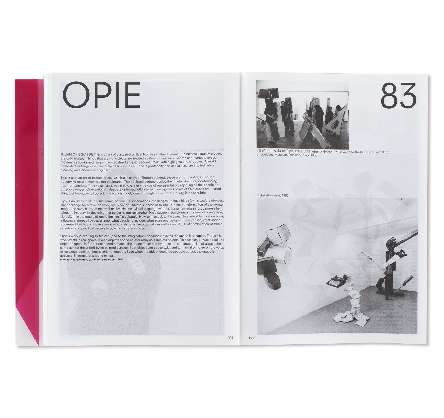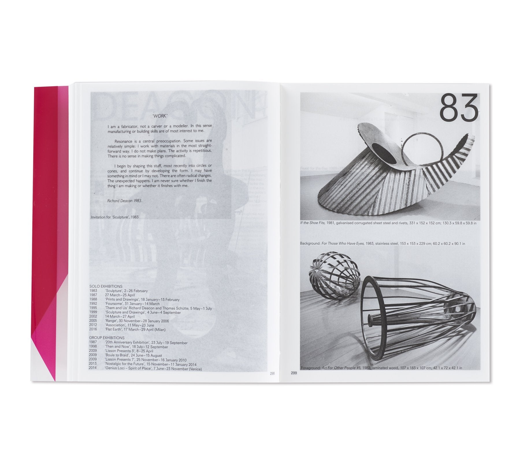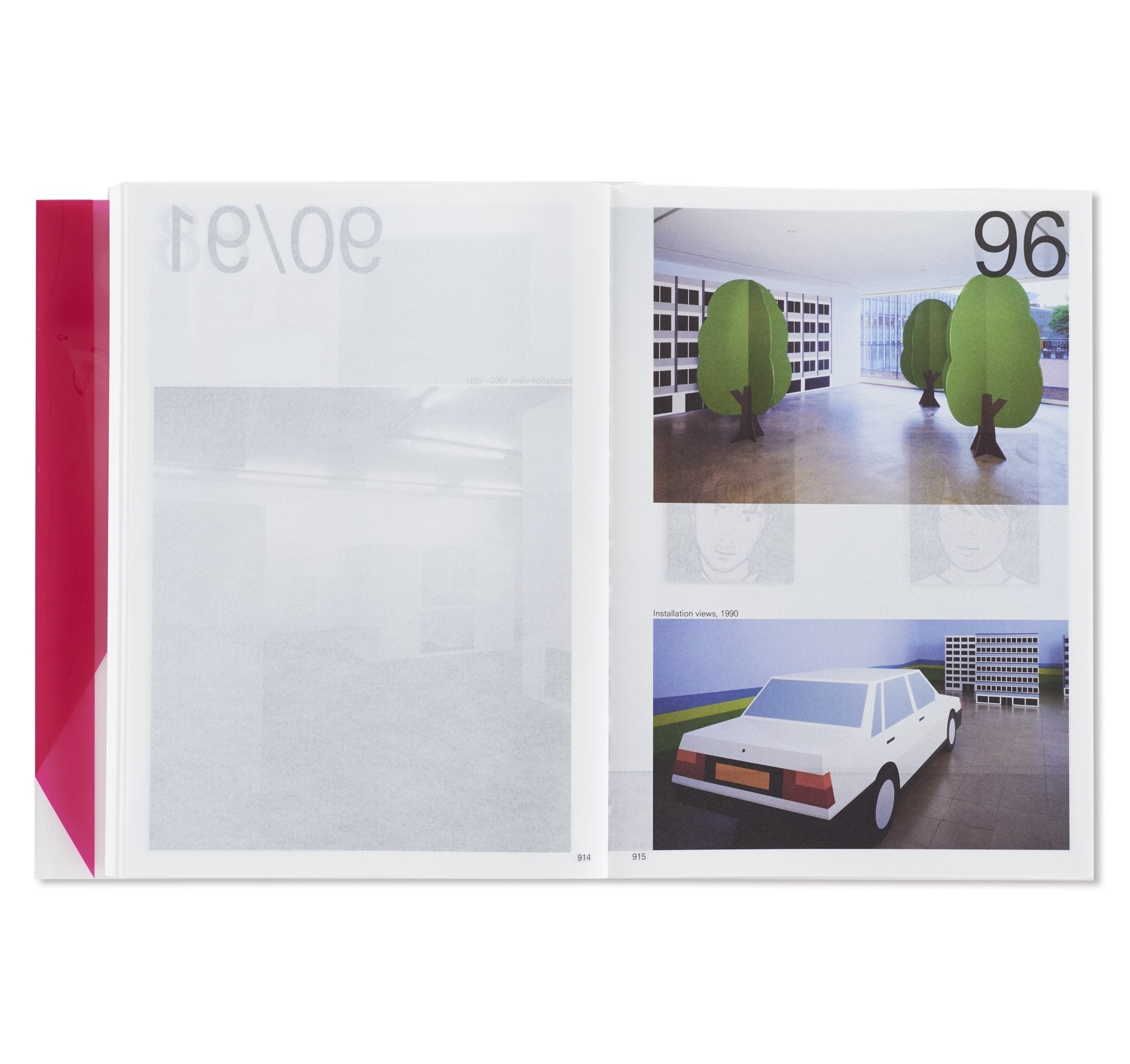 オランダ人デザイナー、イルマ・ボーム(Irma Boom)によって手掛けられた本書は、マリーナ・アブラモヴィッチ(Marina Abramović)に始まり、アイ・ウェイウェイ(Ai Weiwei)、ジョン・アコマフラ(John Akomfrah)からフレッド・サンドバック(Fred Sandback)、ローレンス・ウィナー(Lawrence Weiner)まで、同ギャラリーに所属してきたアーティスト達をアルファベット順に掲載。1000ページを超えるボリュームとなる同書には、同ギャラリーで行われてきた150名以上のアーティスト達による500以上に及ぶ展覧会記録と共に、この半世紀で重要とされてきた批評家達が寄せたテキストやレビュー、過去出版物からの抜粋などが添えられる形で収録。これらのアーカイブの中には、リチャード・ディーコン(Richard Deacon)によるスケッチやソル・ルウィット(Sol LeWitt)が手書きで残したカタログレイアウト、更にはカール・アンドレ(Carl Andre)の書いたインスタレーションの指示書にダン・グラハム(Dan Graham)の展覧会メモに加え、アーティスト達がギャラリーの創設者、ニコラス・ログズデイル(Nicholas Logsdail)に宛てたポストカードなど、多種多様な資料も収められており、非常に充実したコレクションが詰まった1冊となっている。箱には、1970年代から同ギャラリーに所属してきたフランス人アーティスト、ダニエル・ビュレン(Daniel Buren)が特別に制作したアートワークが起用されている。