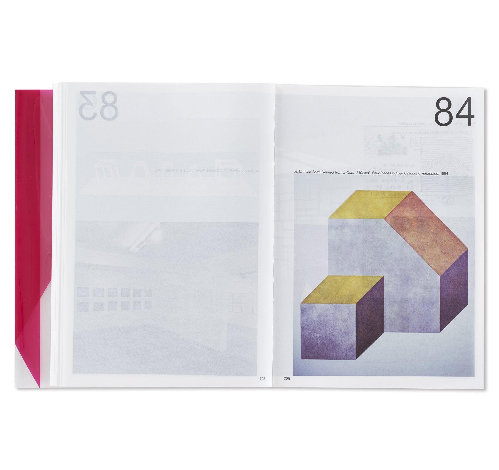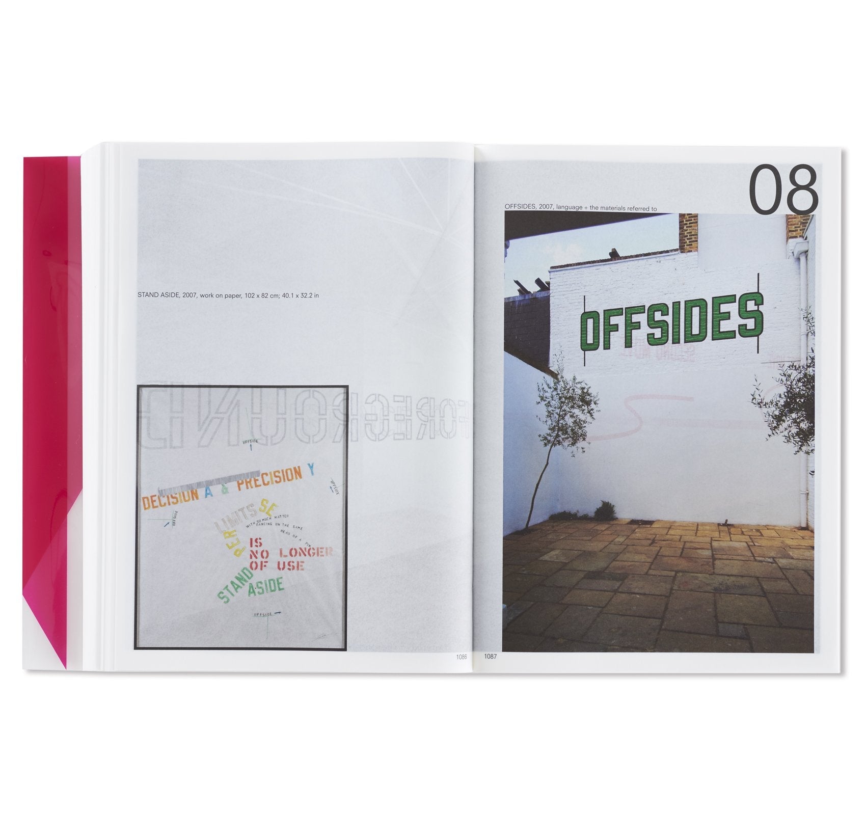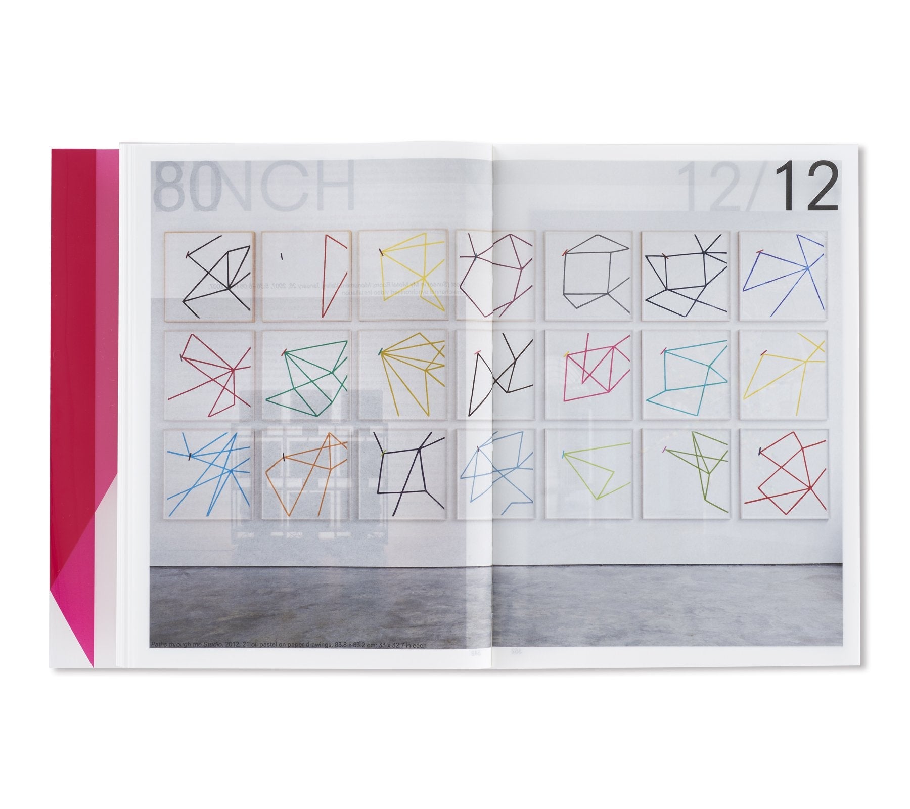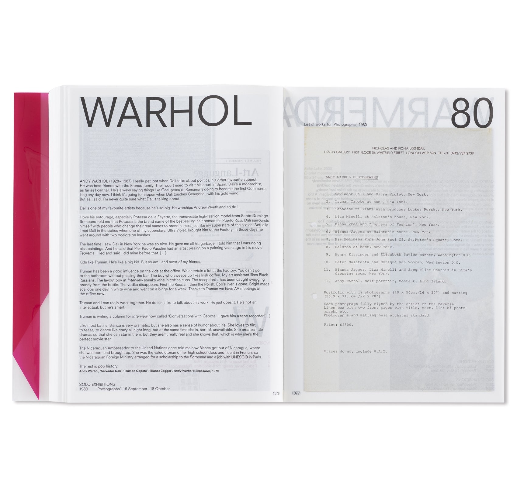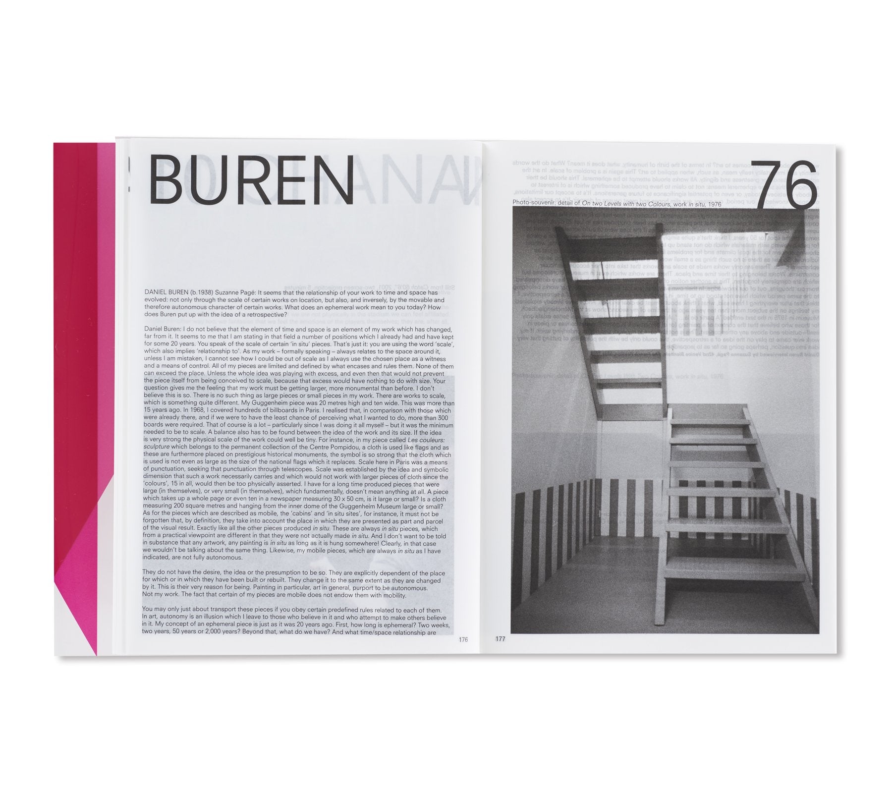 オランダ人デザイナー、イルマ・ボーム(Irma Boom)によって手掛けられた本書は、マリーナ・アブラモヴィッチ(Marina Abramović)に始まり、アイ・ウェイウェイ(Ai Weiwei)、ジョン・アコマフラ(John Akomfrah)からフレッド・サンドバック(Fred Sandback)、ローレンス・ウィナー(Lawrence Weiner)まで、同ギャラリーに所属してきたアーティスト達をアルファベット順に掲載。1000ページを超えるボリュームとなる同書には、同ギャラリーで行われてきた150名以上のアーティスト達による500以上に及ぶ展覧会記録と共に、この半世紀で重要とされてきた批評家達が寄せたテキストやレビュー、過去出版物からの抜粋などが添えられる形で収録。これらのアーカイブの中には、リチャード・ディーコン(Richard Deacon)によるスケッチやソル・ルウィット(Sol LeWitt)が手書きで残したカタログレイアウト、更にはカール・アンドレ(Carl Andre)の書いたインスタレーションの指示書にダン・グラハム(Dan Graham)の展覧会メモに加え、アーティスト達がギャラリーの創設者、ニコラス・ログズデイル(Nicholas Logsdail)に宛てたポストカードなど、多種多様な資料も収められており、非常に充実したコレクションが詰まった1冊となっている。箱には、1970年代から同ギャラリーに所属してきたフランス人アーティスト、ダニエル・ビュレン(Daniel Buren)が特別に制作したアートワークが起用されている。
