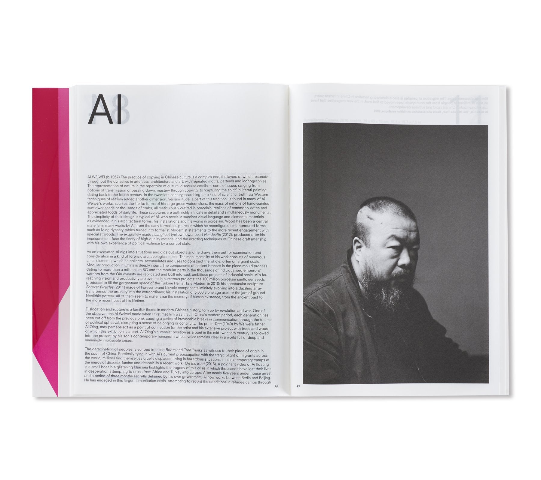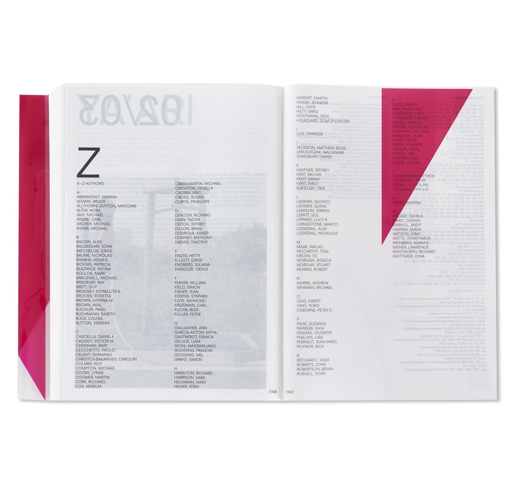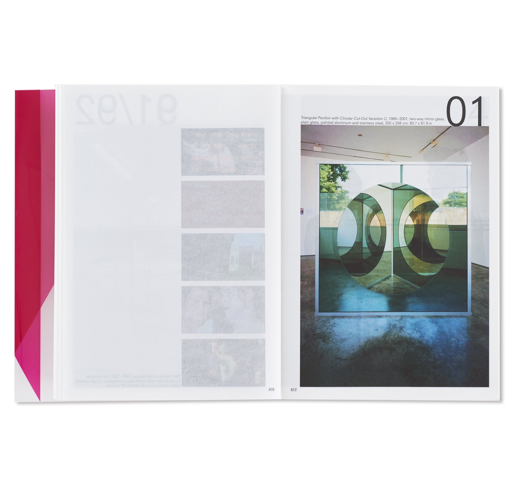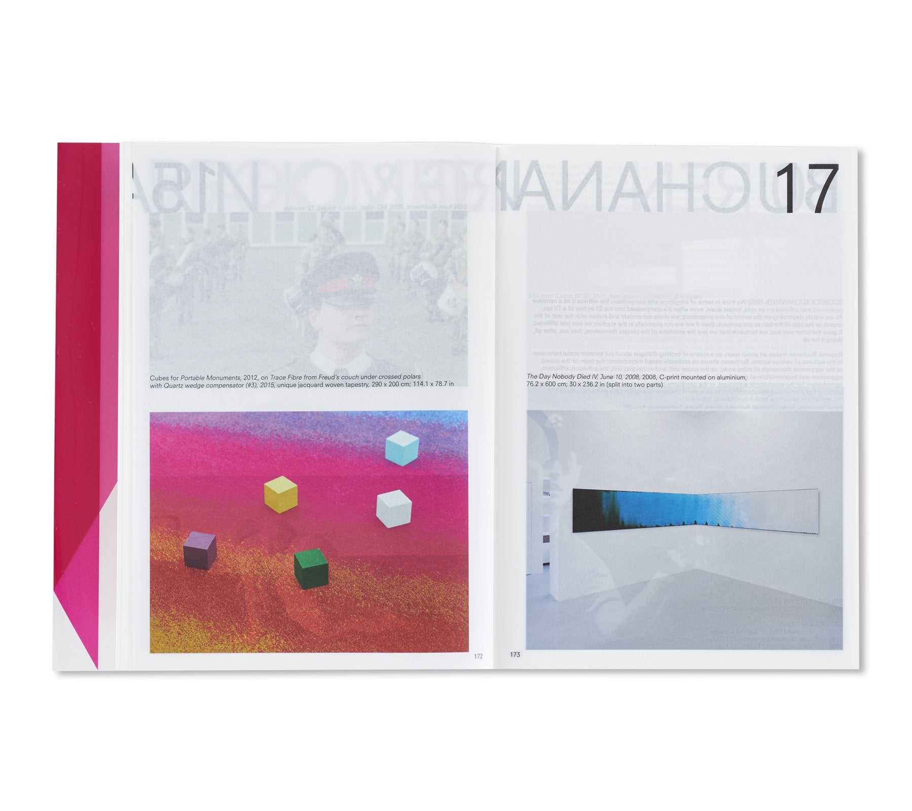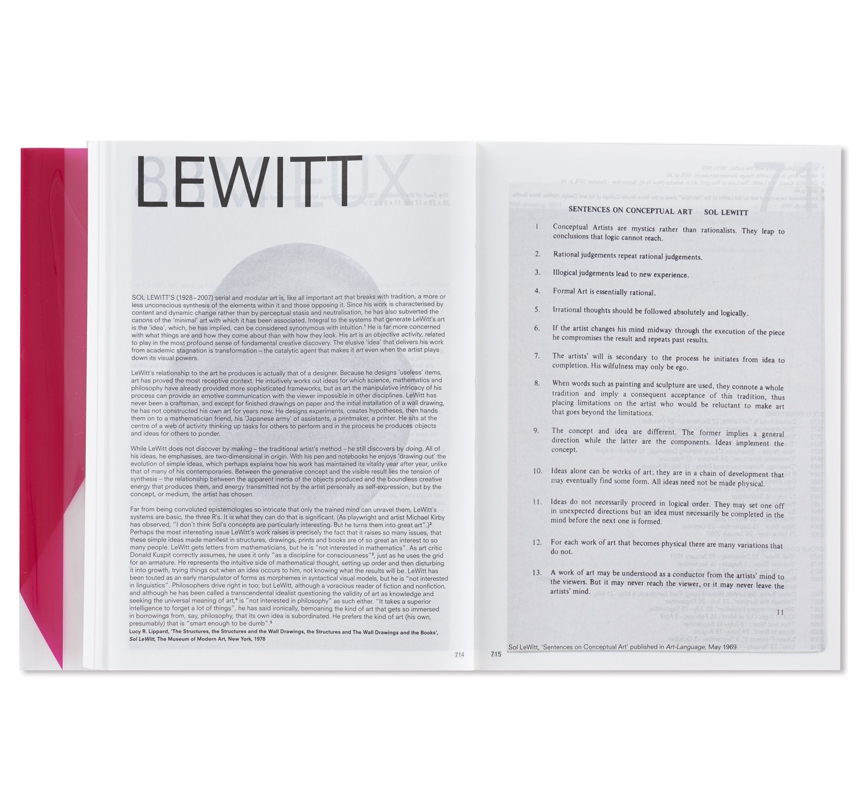 オランダ人デザイナー、イルマ・ボーム(Irma Boom)によって手掛けられた本書は、マリーナ・アブラモヴィッチ(Marina Abramović)に始まり、アイ・ウェイウェイ(Ai Weiwei)、ジョン・アコマフラ(John Akomfrah)からフレッド・サンドバック(Fred Sandback)、ローレンス・ウィナー(Lawrence Weiner)まで、同ギャラリーに所属してきたアーティスト達をアルファベット順に掲載。1000ページを超えるボリュームとなる同書には、同ギャラリーで行われてきた150名以上のアーティスト達による500以上に及ぶ展覧会記録と共に、この半世紀で重要とされてきた批評家達が寄せたテキストやレビュー、過去出版物からの抜粋などが添えられる形で収録。これらのアーカイブの中には、リチャード・ディーコン(Richard Deacon)によるスケッチやソル・ルウィット(Sol LeWitt)が手書きで残したカタログレイアウト、更にはカール・アンドレ(Carl Andre)の書いたインスタレーションの指示書にダン・グラハム(Dan Graham)の展覧会メモに加え、アーティスト達がギャラリーの創設者、ニコラス・ログズデイル(Nicholas Logsdail)に宛てたポストカードなど、多種多様な資料も収められており、非常に充実したコレクションが詰まった1冊となっている。箱には、1970年代から同ギャラリーに所属してきたフランス人アーティスト、ダニエル・ビュレン(Daniel Buren)が特別に制作したアートワークが起用されている。