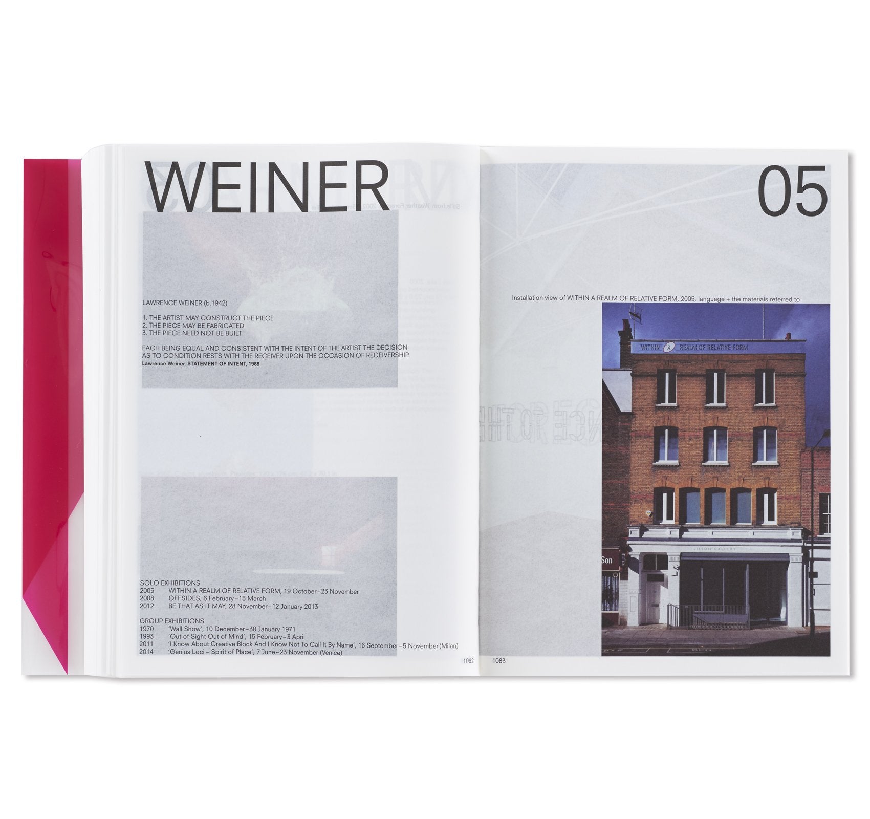 ARTIST | WORK | LISSON documents the history and legacy of Lisson Gallery over the past 50 years. Under the art direction of famed Dutch designer Irma Boom, the publication features an A-to-Z of every artist who has had a solo exhibition at the gallery: from ABRAMOVIC, AI, AKOMFRAH, ANDRE and ARCANGEL to RYMAN, SANDBACK and WEINER. The gallery’s extensive and unique archive provides the publication with more than 2,000 illustrations gathered from five decades of resources. Running over 1,000 pages, the book provides a double page spread to each artist for each exhibition he or she has had at the gallery – over 500 exhibitions in total. Each artist’s section is accompanied by a short narrative, notable review or previously published extract by many of the finest writers of the last half century including: Stuart Morgan, Okwui Enwezor, Iwona Blazwick, Germano Celant, Chrissie Iles, Lisa Phillips, Roberta Smith, Homi K Bhabha, Tom McCarthy and Robert Storr. Critical texts are placed alongside sketches by artists such as Richard Deacon or hand-drawn layouts for catalogues by Sol LeWitt, as well as installation instructions from Carl Andre or exhibition notes by Dan Graham. The publication also contains images of postcards addressed to the gallery’s founder Nicholas Logsdail over the last 50 years, from artists including Ceal Floyer, Shirazeh Houshiary, Anish Kapoor, On Kawara and Richard Long. As well as a deep collection of textual, archival and visual material, ARTIST | WORK | LISSON includes a number of short essays by Nicholas Logsdail and other members of Lisson Gallery, including Greg Hilty (Curatorial Director), Alex Logsdail (International Director) and Ossian Ward (Head of Content). Since its inception in 1967, Lisson has had a presence on Bell Street near Edgware Road station in London and now encompasses two locations in the area and two in New York. The publication captures a snapshot of the evolving art scenes of these communities over the last half-century, as well as various locations around the world through the gallery’s participation in art fairs, biennales and off-site projects. These contributions, distributed throughout the book, address specific themes relevant to the gallery’s unrivalled longevity and position at the center of international contemporary art. The box of ARTIST | WORK | LISSON SPECIAL EDITION has been specially designed by Daniel Buren, who has been exhibiting at Lisson Gallery since the 1970s.