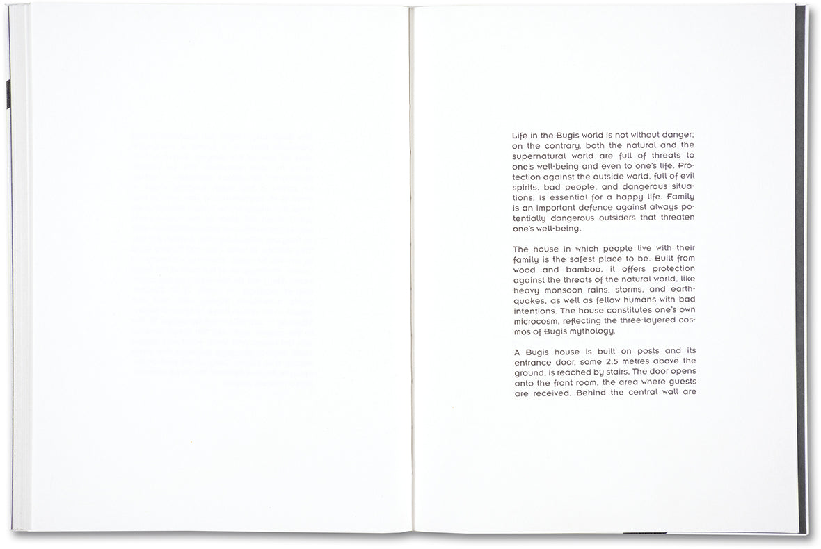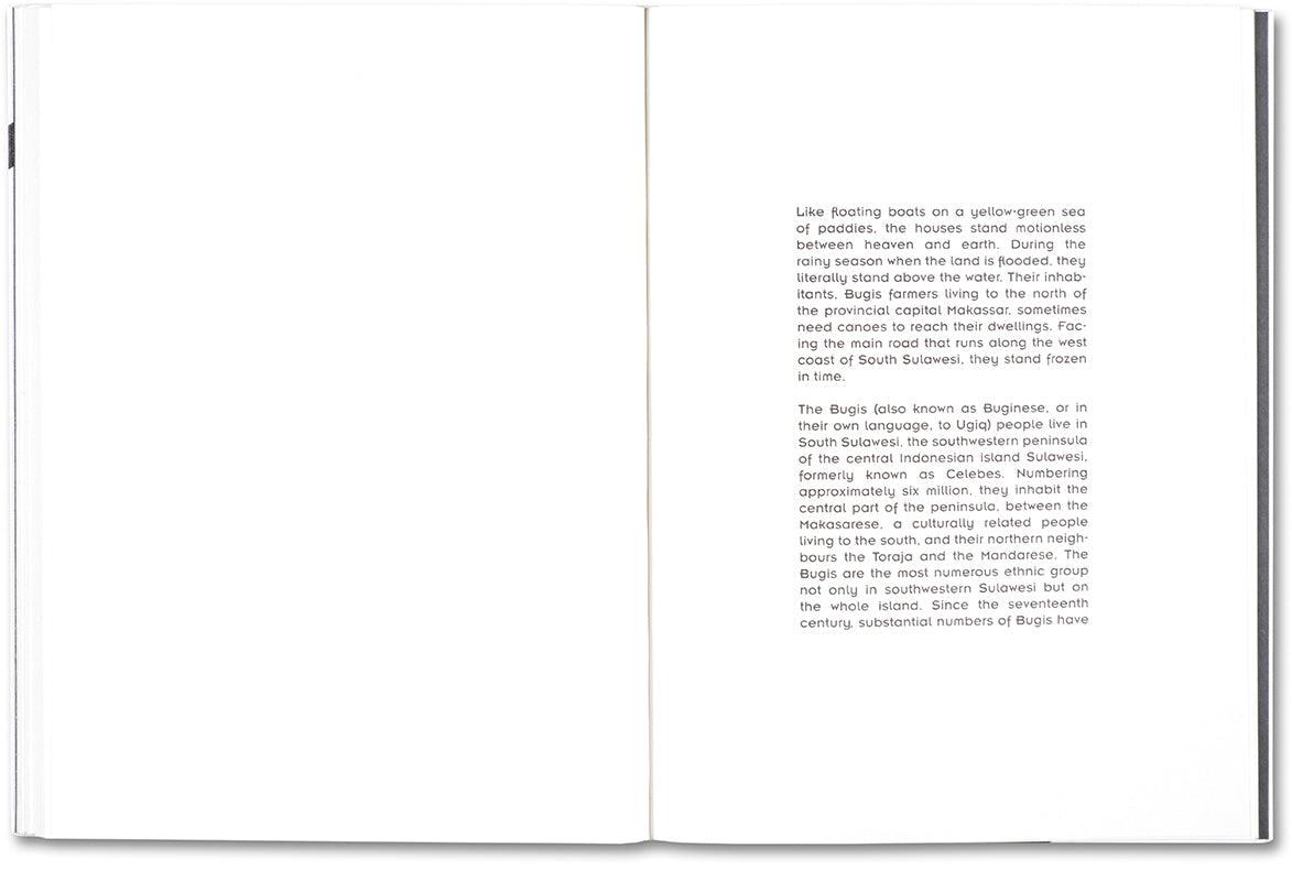 Poised between heaven and earth and standing above the water when the rice fields are flooded, the Bugis houses reflect the creation myth of their people, in which the gods of the upper and lower worlds came together to create man to populate the uninhabited middle world. The farmers depicted by Schulz-Dornburg are likewise suspended between historic tradition and the impending pressures of the contemporary world. As they go about their work or greet her camera, they and their homes are held in the balance between past and future, mythology and everyday reality.