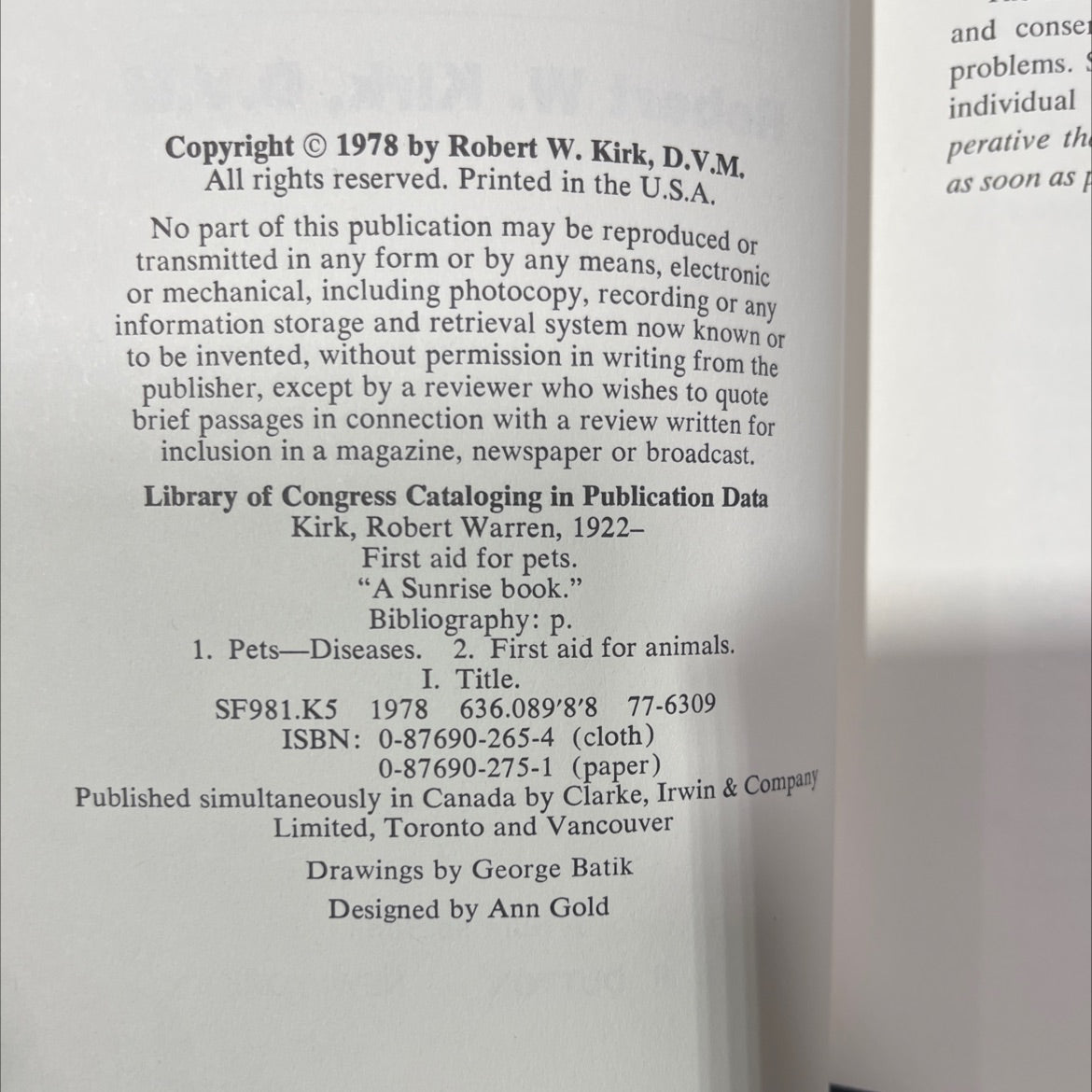 Rare collectible book priced at $25, 'first aid for pets' by robert w. kirk, d.v.m., unknown,a sunrise book sold by Black Octopus Books. This book features a Hardcover binding, and was published in 1978 by e. p. dutton. The photos are of the EXACT copy of the book you will receive, condition and all. Here's a list of all the book stats!
