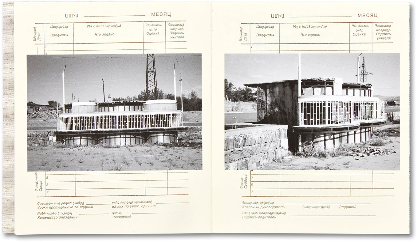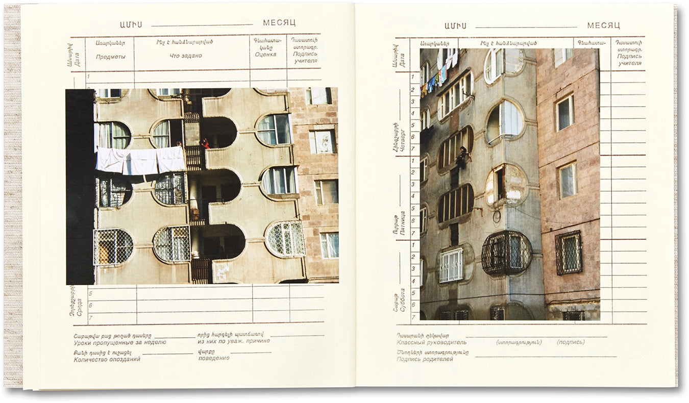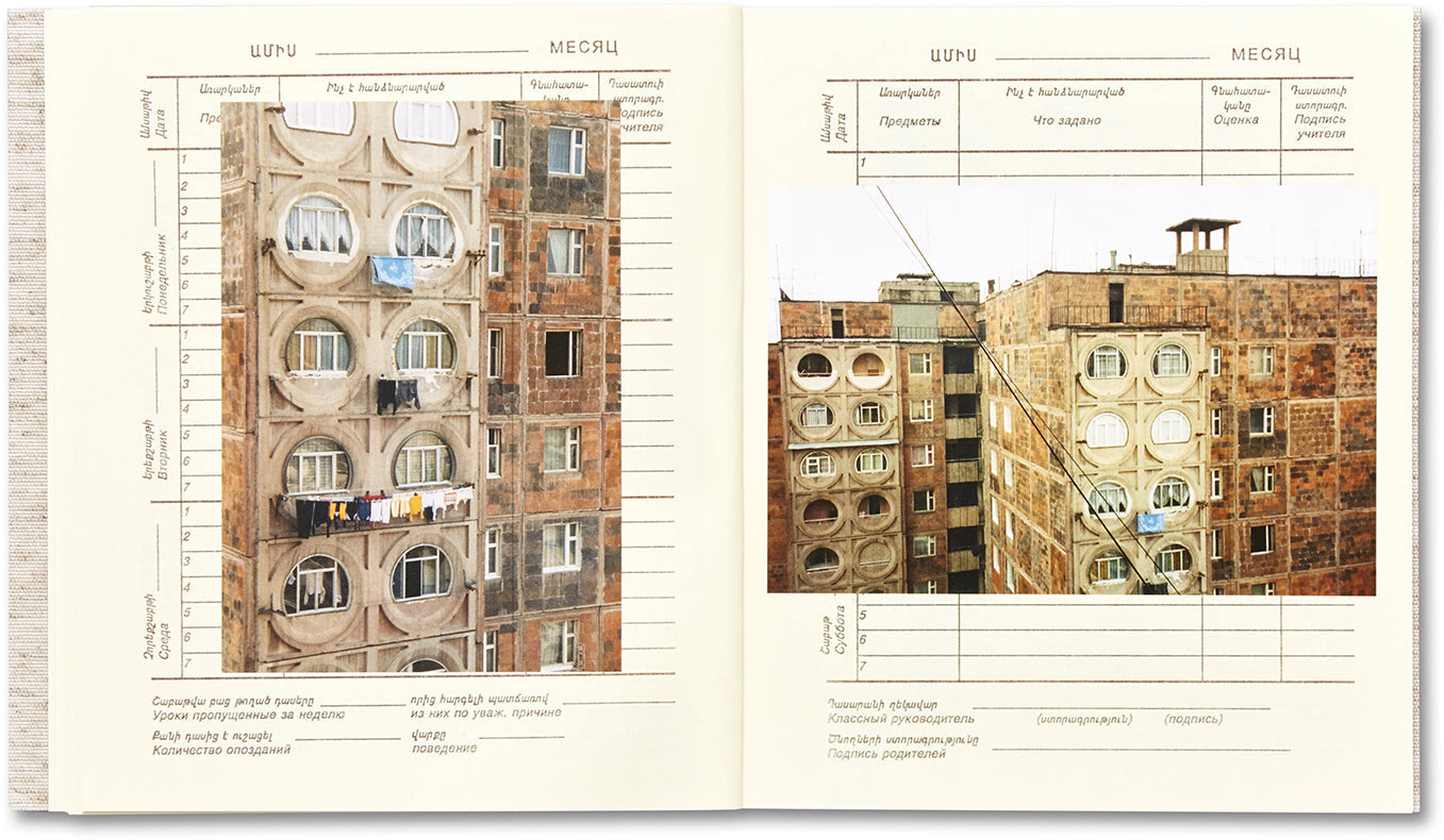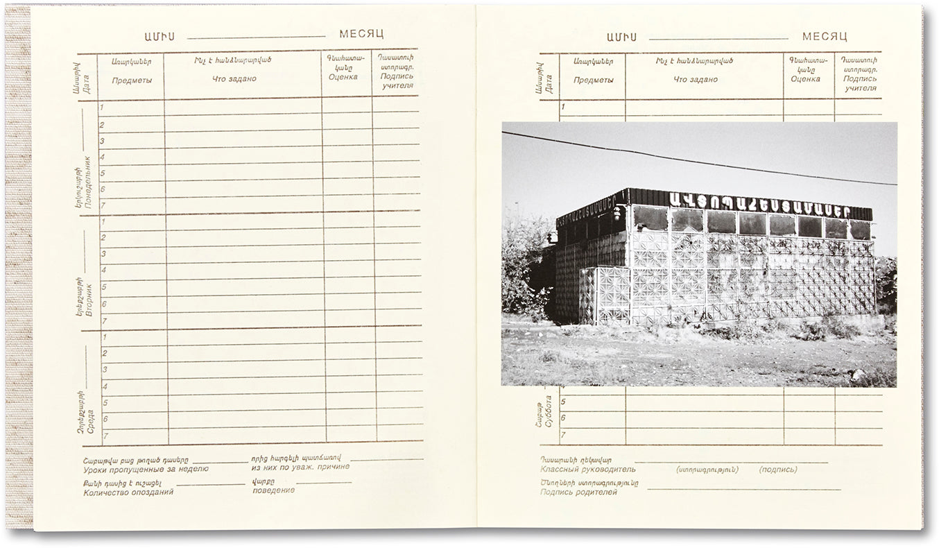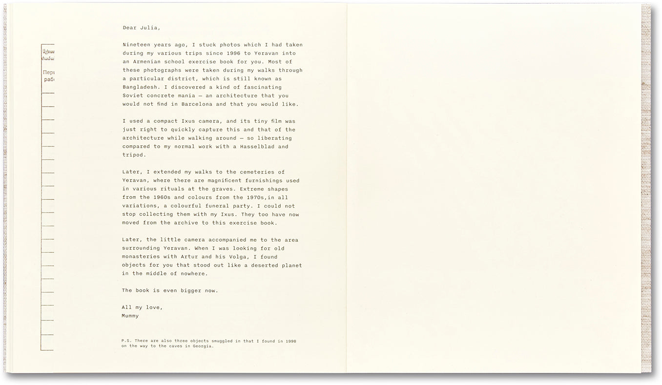 Throughout her prolific career, Ursula Schulz-Dornburg has led the way in documenting man-made environments on the cusp of change and transition. The sites she visited were often remote and difficult to access. In 1996 and 1997 she travelled to Armenia and with a small portable camera made visual notes of remnants of Soviet architecture during her walks through the capital city of Yerevan. She developed the films on her return to Germany and in 2001 she edited and compiled the prints into a traditional notebook used in Armenian schools which she had bought back from one of her trips. This hand-made sketchbook was then dedicated to her daughter, Julia, who was studying architecture at the time.