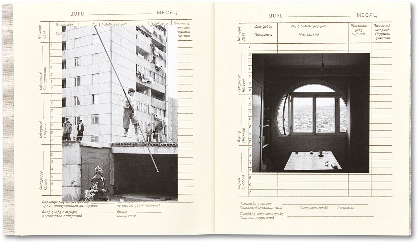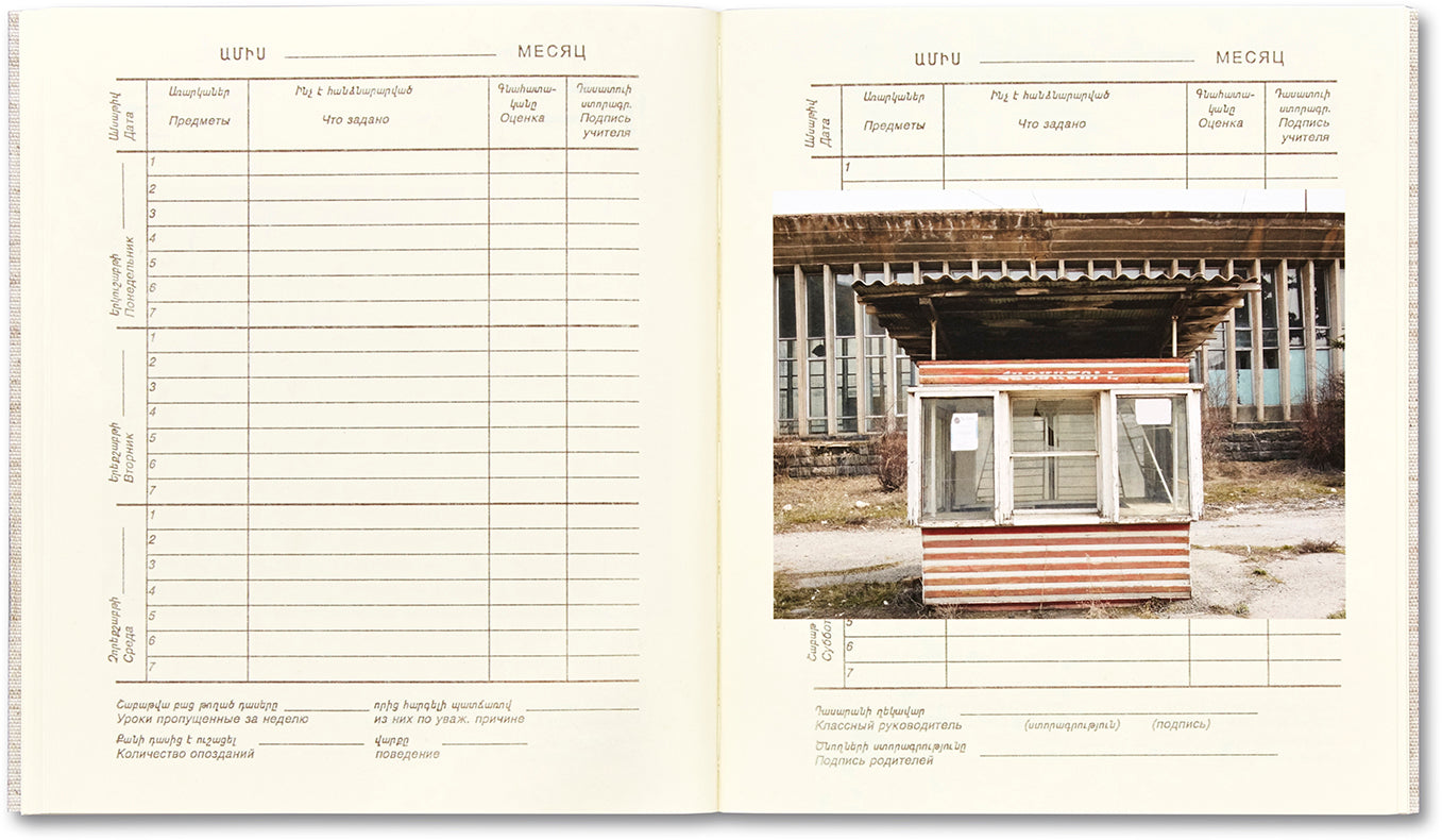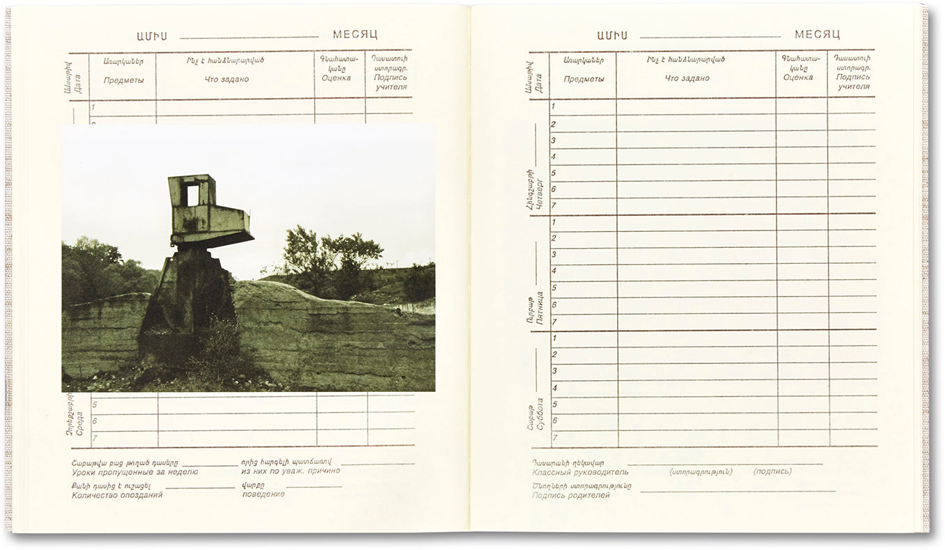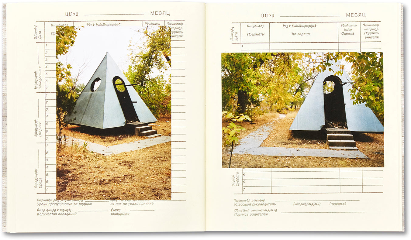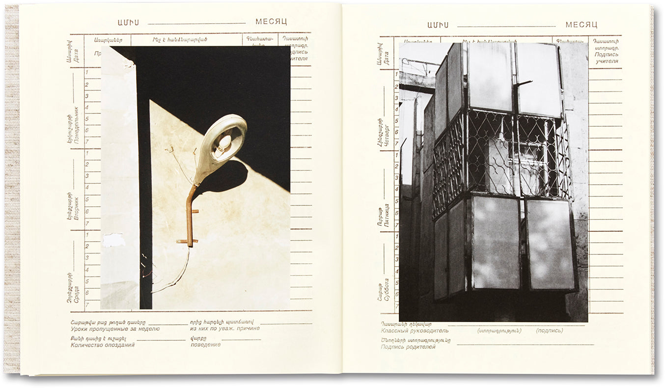 Throughout her prolific career, Ursula Schulz-Dornburg has led the way in documenting man-made environments on the cusp of change and transition. The sites she visited were often remote and difficult to access. In 1996 and 1997 she travelled to Armenia and with a small portable camera made visual notes of remnants of Soviet architecture during her walks through the capital city of Yerevan. She developed the films on her return to Germany and in 2001 she edited and compiled the prints into a traditional notebook used in Armenian schools which she had bought back from one of her trips. This hand-made sketchbook was then dedicated to her daughter, Julia, who was studying architecture at the time.