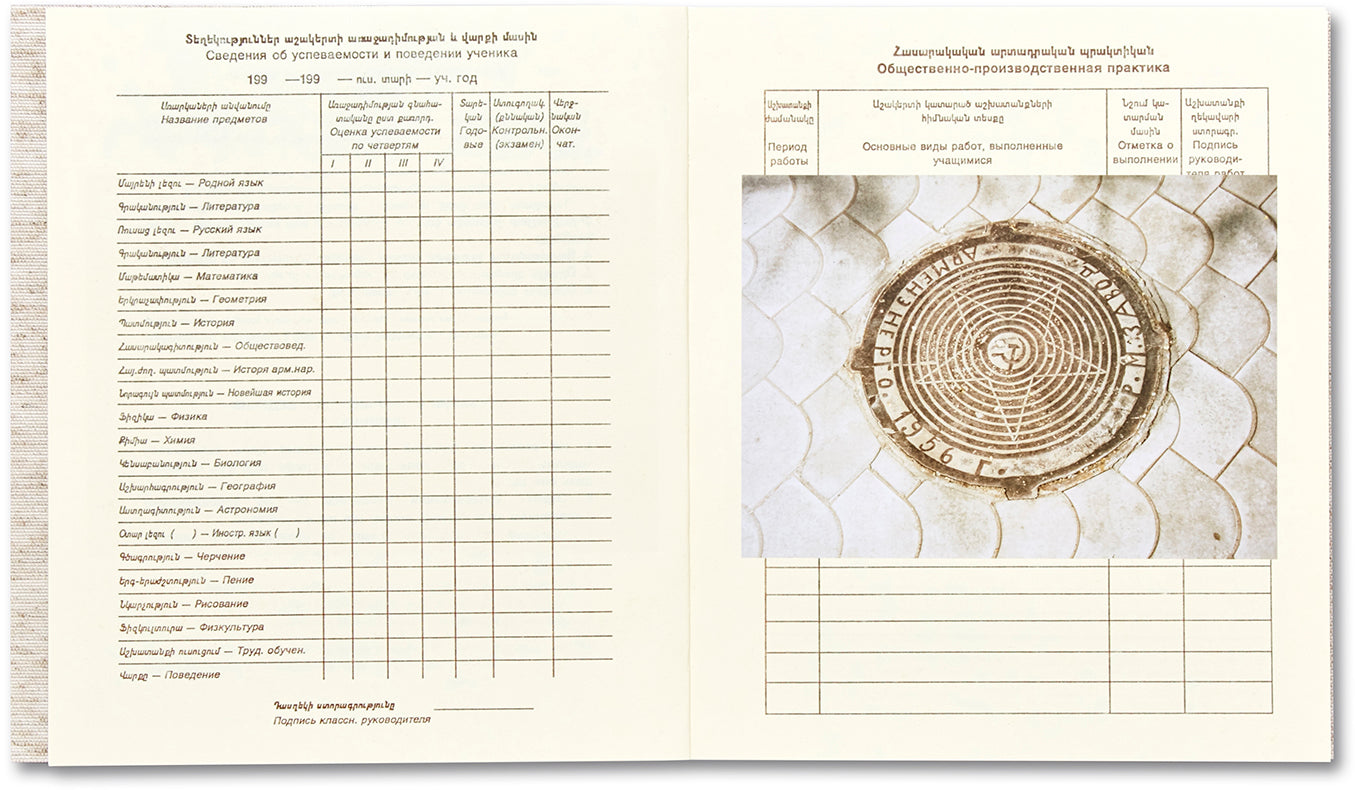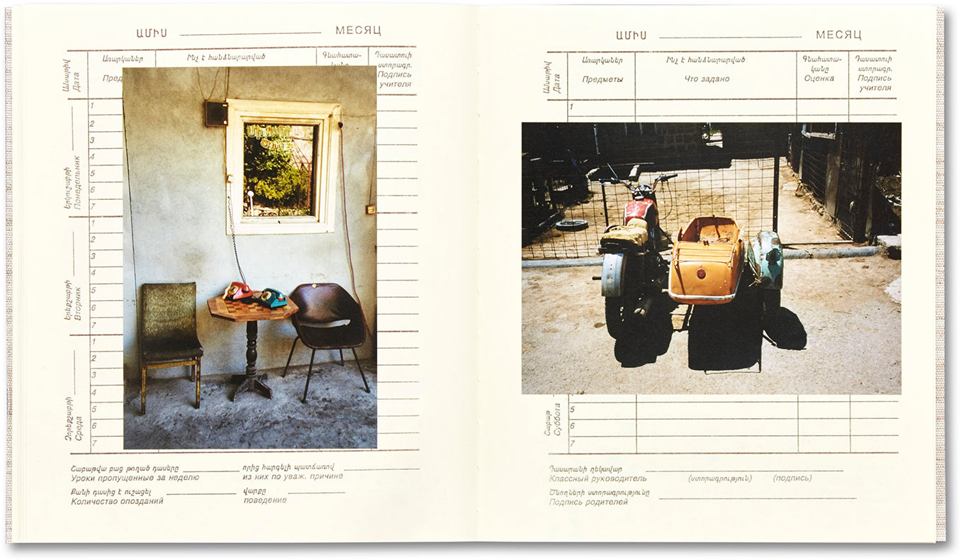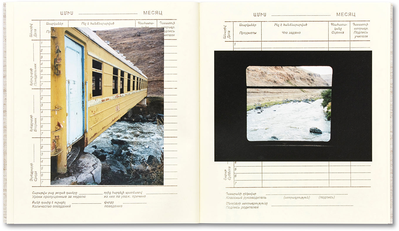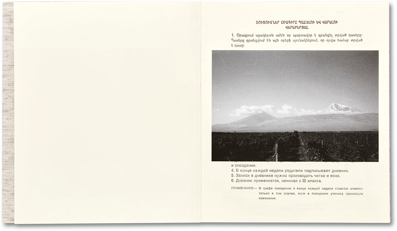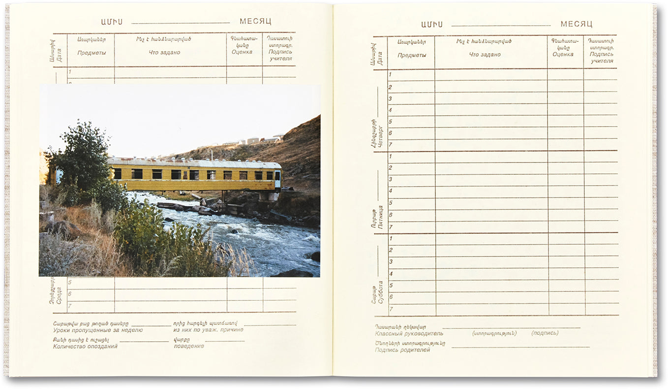Throughout her prolific career, Ursula Schulz-Dornburg has led the way in documenting man-made environments on the cusp of change and transition. The sites she visited were often remote and difficult to access. In 1996 and 1997 she travelled to Armenia and with a small portable camera made visual notes of remnants of Soviet architecture during her walks through the capital city of Yerevan. She developed the films on her return to Germany and in 2001 she edited and compiled the prints into a traditional notebook used in Armenian schools which she had bought back from one of her trips. This hand-made sketchbook was then dedicated to her daughter, Julia, who was studying architecture at the time.